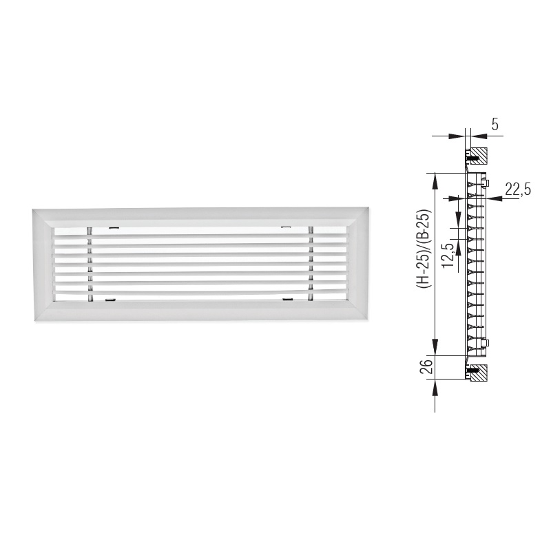 Kratka aluminiowa ze stałymi, poziomymi lamelami. Rekomendowana do stosowania w instalacjach wentylacyjnych nisko- i średniociśnieniowych.