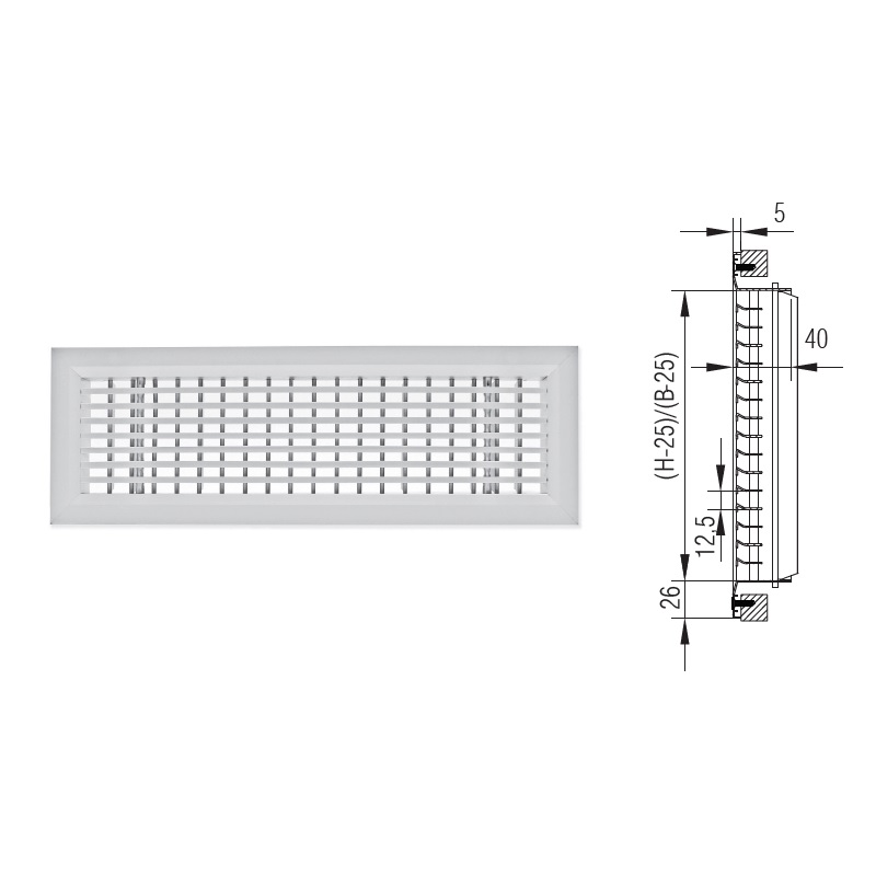Kratka aluminiowa z podwójnym rzędem stałych lamel, frontowe lamele poziome, tylne pionowe.