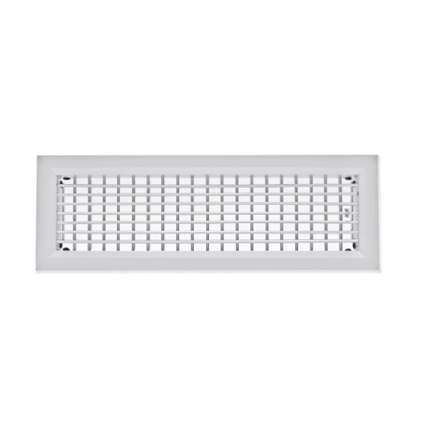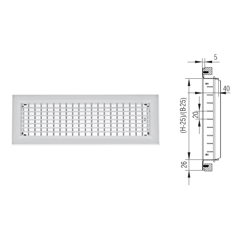 Kratka aluminiowa z podwójnym rzędem nastawnych lamel, frontowe lamele poziome, tylne pionowe.