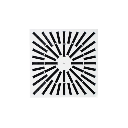 Kwadratowy panel czołowy wyposażony w nastawne kierownice z tworzywa sztucznego powodujące zawirowanie strumienia powietrza.