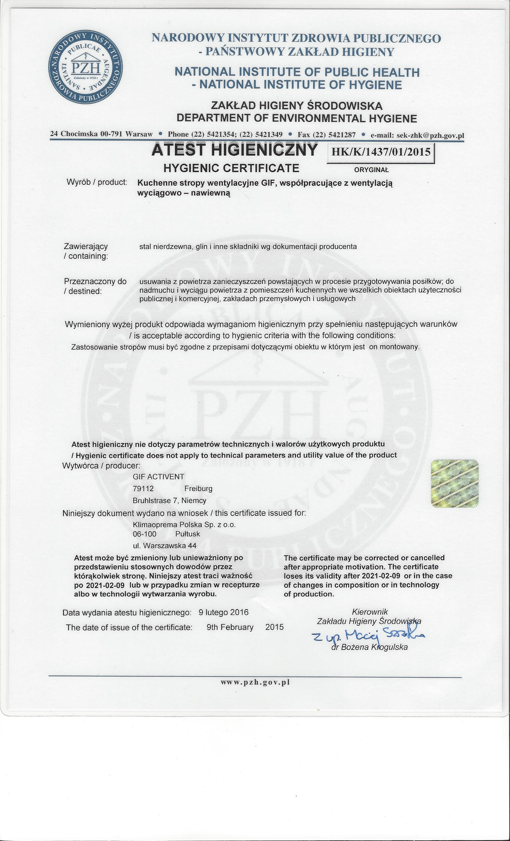 Dzięki zainstalowanym kasetom wyciągowym, wentylacja sufitowa usuwa aż do 97% zanieczyszczeń z powietrza w pomieszczeniu, w tym tłuszcz i parę wodną. Proces filtracji oparty jest na zjawiskach wykraplania i bezwładności masowej zanieczyszczeń w filtrze labiryntowym. Sufit kuchenny GIF pozwala również na usunięcie całości energii cieplnej generowanej przez urządzenia w kuchni.